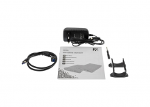 Förpackningen innehåller: kabinett, stativ, skruvmejsel, USB-kabel och nätadapter.